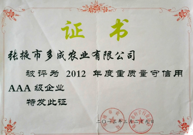 2012年度重質(zhì)量守信用AAA級企業(yè)