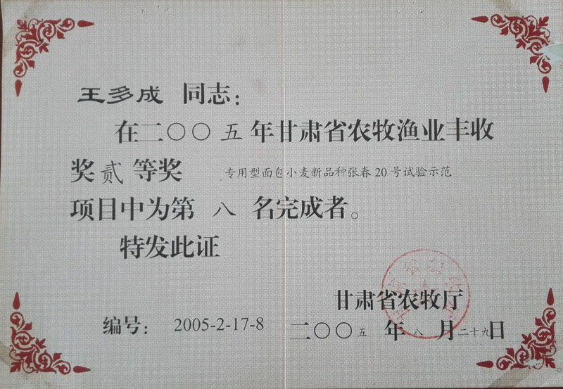2005年甘肅省農(nóng)牧漁業(yè)豐收獎二等獎